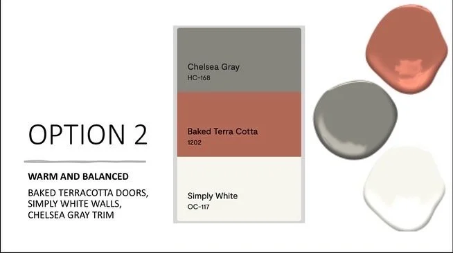 Skye Condos had an underwhelming appearance with dingy off-white walls and boring blue doors. Color can be overwhelming, it’s a commitment after all. I made it easy for the residents to choose the colors for their common spaces by offering some schemes. Ultimately they went for a warm and inviting Baked Terra Cotta scheme.